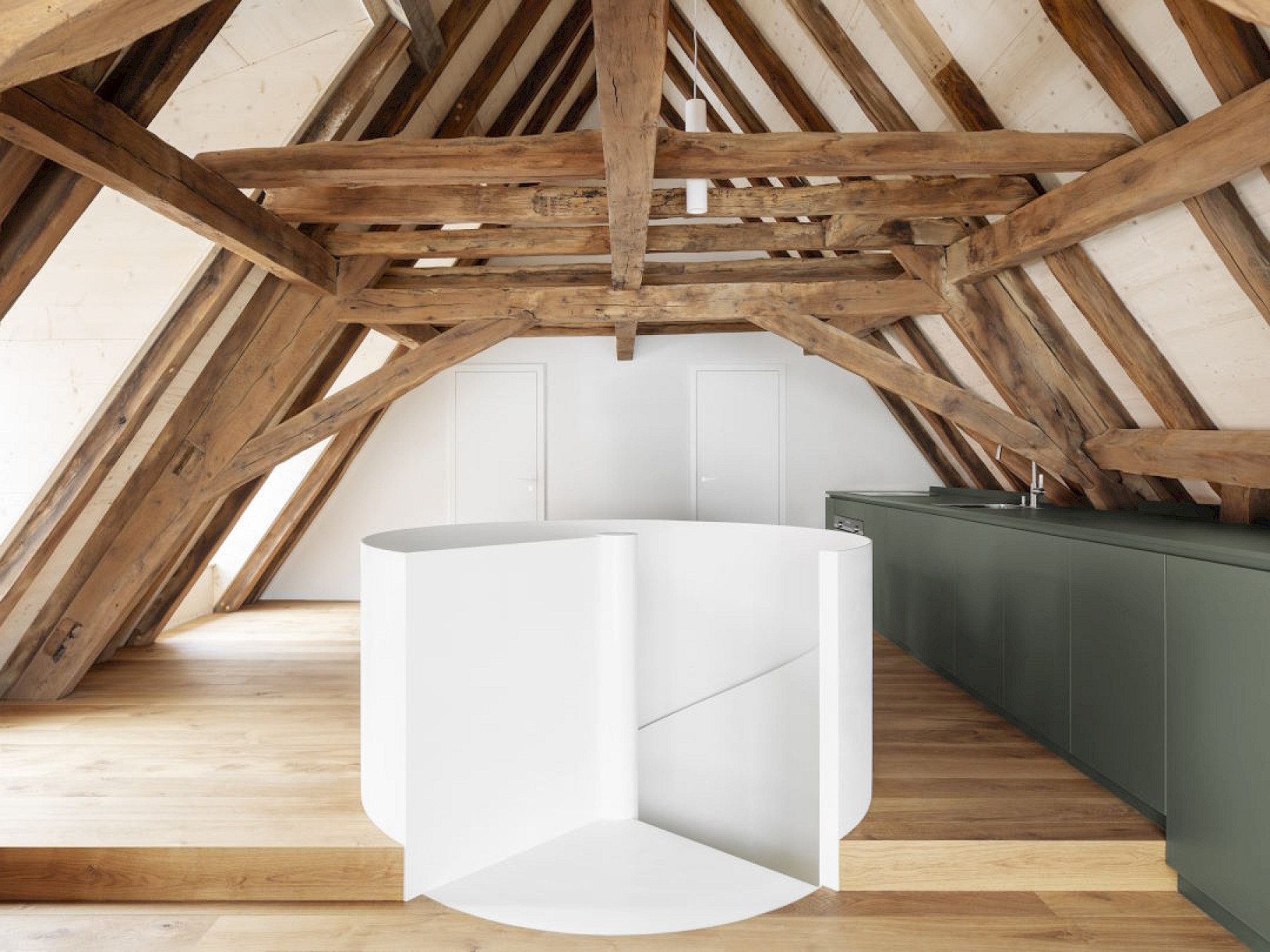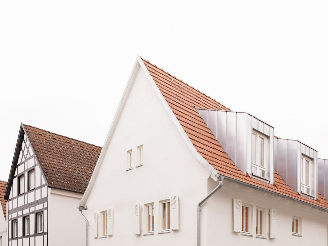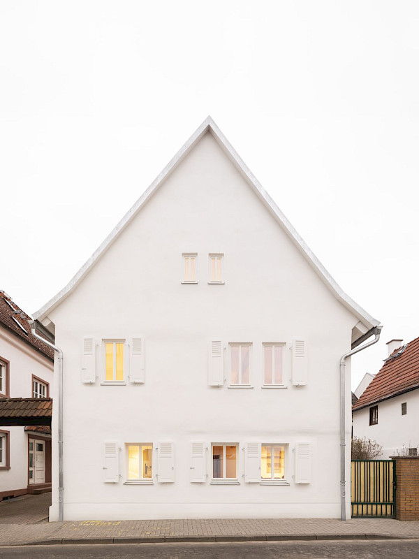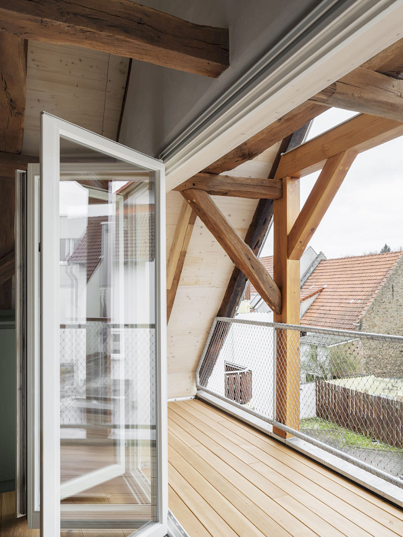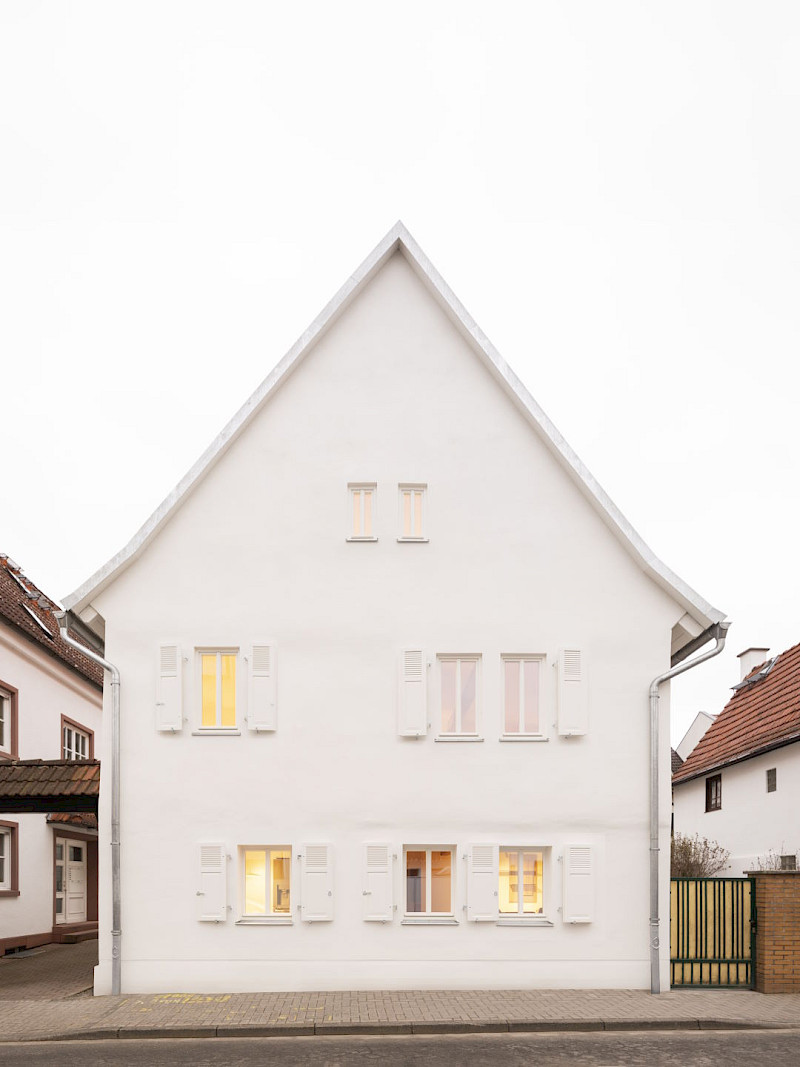 Darüberhinaus wurde das Innere neu organisiert, sodass im Erdgeschoss und im 1. Obergeschoss zusammen mit dem neuausgebauten Dachgeschoss jeweils voneinander getrennte Wohneinheiten entstehen. Die Erschließung der oberen Wohnung wurde über eine Außentreppe im Innenhof gelöst.