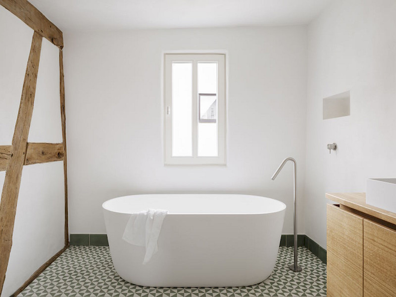 Wiederkehrende Materialien sind Holz und Lehm. Man findet sie in Form von Lehmputz, Holzfenstern und -böden, Möbel aus Holz, den freigelegten Deckenbalken und des sichtbaren Sprengwerks im Dachgeschoss, das zu einem großen Wohnbereich ausgebaut wurde.